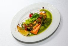 150/110/40/1 г • Филе семги соус песто, лимон, салат, зелень