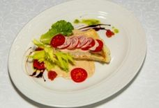 100/5/40/50 г • Филе судака, икра красная, соус ореховый, помидоры черри, зелень