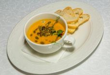250/15 г • Тыква, морковь, лук, чеснок, сливки, гренки, семена тыквы, зелень