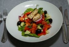 235/2 г • Ростбиф жареный, огурец, помидор, перец, сыр брынза, грецкий орех, заправка, салат-микс