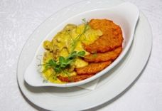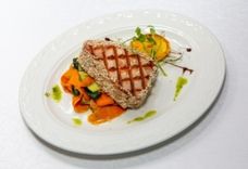 Тунец в пряной панировке с припущенными овощами