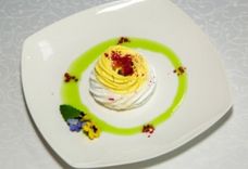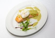 150/40/55/1 г • Филе сёмги, соус из зеленого горошка, яйцо пашот, базилик