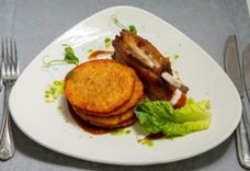 20/20/180/20/12 г • Драники, сёмга слабой соли, икра красная, лимон, салат микс