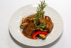 220/2 г • Филе куриное, кабачек-цукини, баклажаны, морковь, лук, перец свежий, масло, чеснок, кунжут, соль, соевый соус, зелень