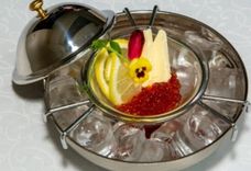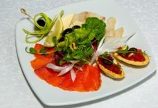 50/50/90/60/10 г • Сёмга слабой соли, филе масляной рыбы, тарталетки с икрой, масло сливочное, лимон, маслины, зелень