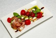 230/50 г • Помидоры, сыр моцарелла, прошутто, соус песто, базилик