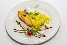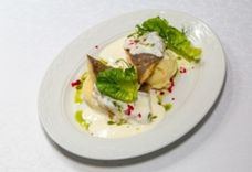 Палтус жареный на картофельном пюре с соусом Мартини