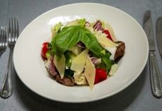 230/2 г • Вырезка говядины жареная, сыр пармезан, помидоры черри, салатный микс, заправка лимонная