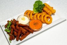 300/50/50/2 г • Сырные палочки, луковые кольца, гренки из хлеба, соус